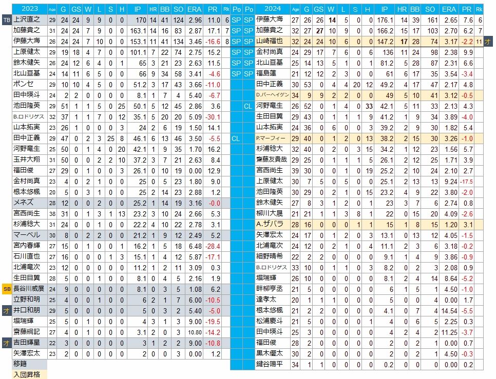 2023年と24年の投手陣の推移