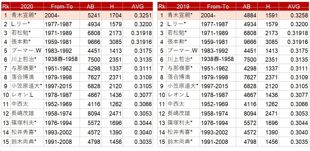 そこに2018年、NPBに復帰して1年目の青木がトップに立つ。復帰1年目に.327を記録。打数も4000を超えた。この時点で37歳。ここから順位をキープするのが厳しいのだ。