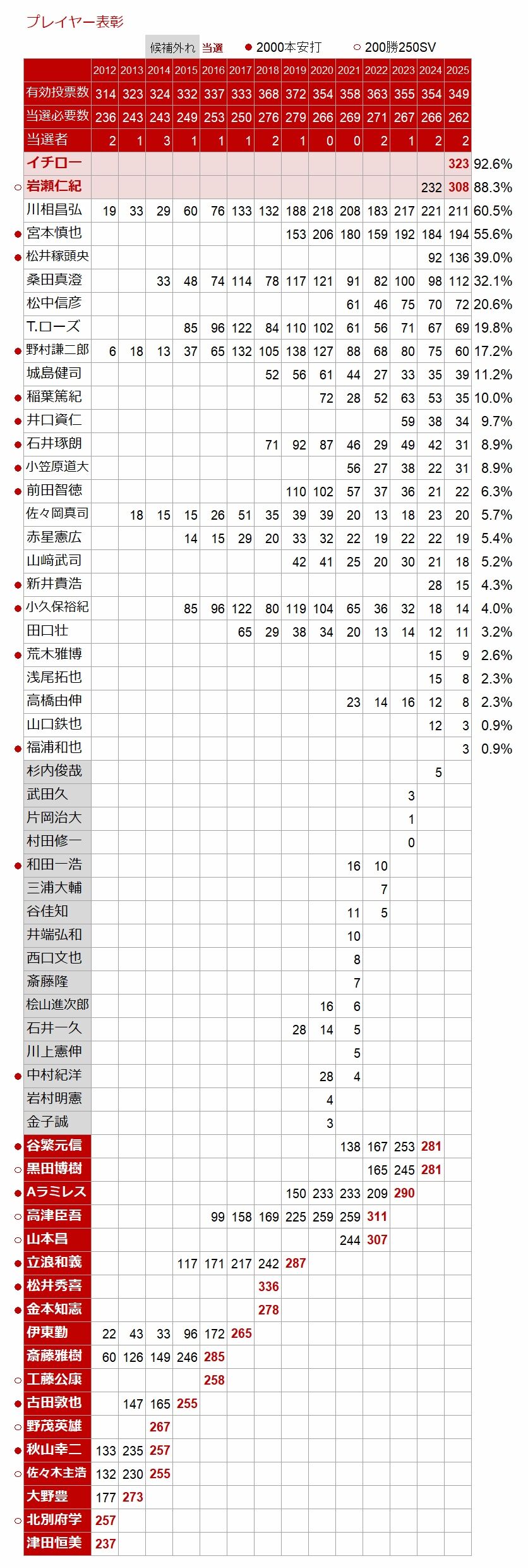 野球殿堂表彰の「プレイヤー部門」の投票結果