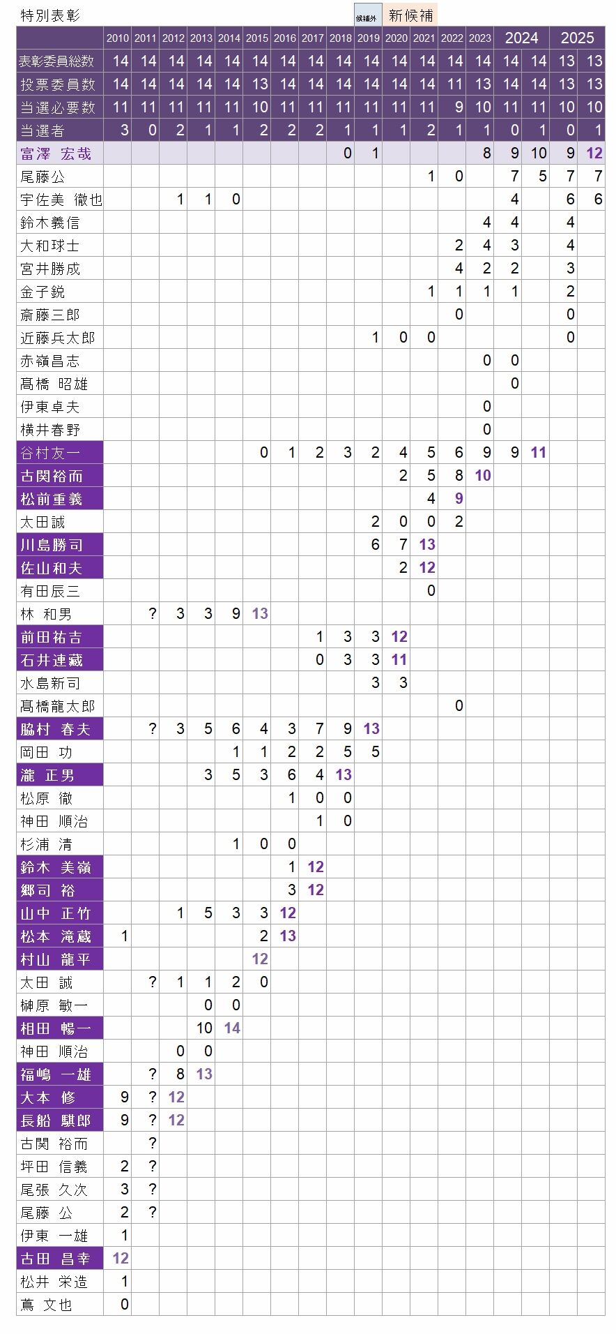 これもなかなか微妙だが、プロアマで野球に貢献した人を、有識者14人が先行することになっている。14人は少なすぎると思うが、2010年からの投票の推移。