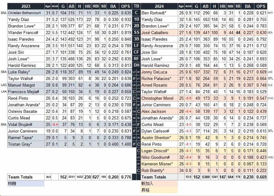 20本塁打を打った、ディアズ、ブランドン・ロー、パレイデス、アロザレーナ、シリ、ジョシュ・ローの内、ブランドンを除く5人の本塁打が減少した。