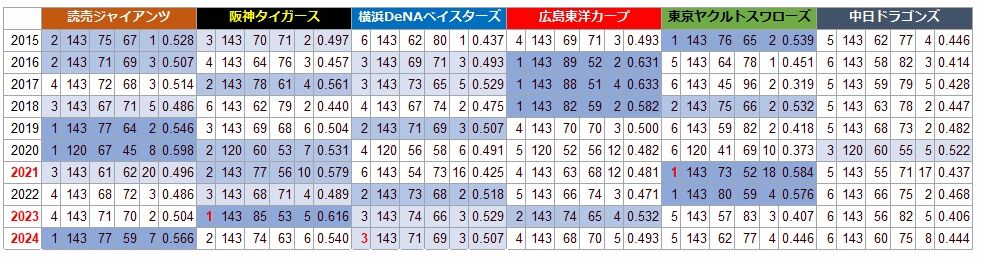 2015年から24年のセ・リーグ6球団の順位、勝敗。赤字は日本一。