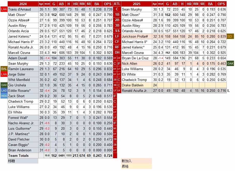 パドレスから脂ののった盛りのジュリクソン・プロファーを獲得。これは大きなプラスだったが、チームの柱で、23年のMVPだったアクーニャJr.が昨年の5月26日に左ひざの前十字じん帯を断裂。手術を受けた。アクーニャJr.は、21年にも左ひざの前十字じん帯を断裂を負傷している。