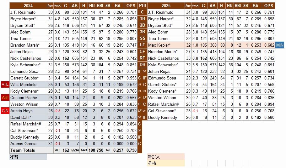 カイル・シュワーバー、ブライス・ハーパー、カステヤノス、ターナー、リアルミュートと働き盛りの選手がレギュラー。計算できる選手がそろっている。