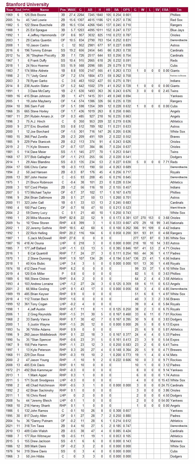 この表にはないが、ドラフト制以前の選手も含めれば35人のメジャーリーガーを輩出している。