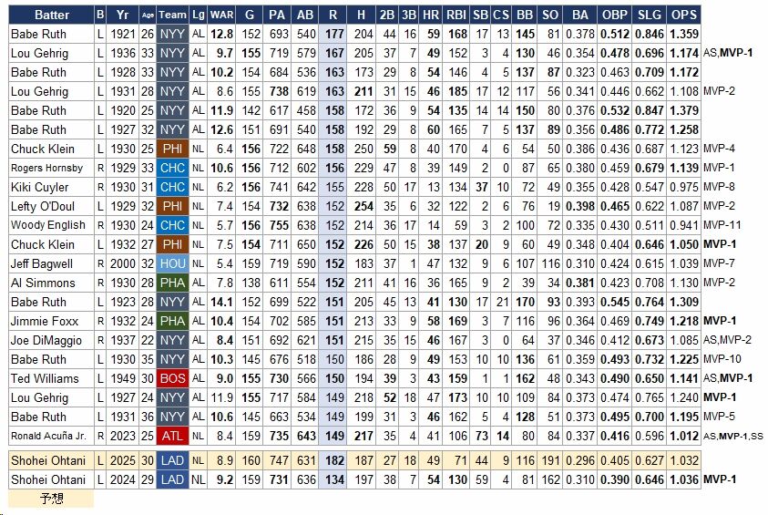 MLBがア・ナ両リーグに分立した1901年以降のMLBのシーズン最多得点20傑、最下段に大谷の2025年の想定される成績と、2024年の実績も加えた。