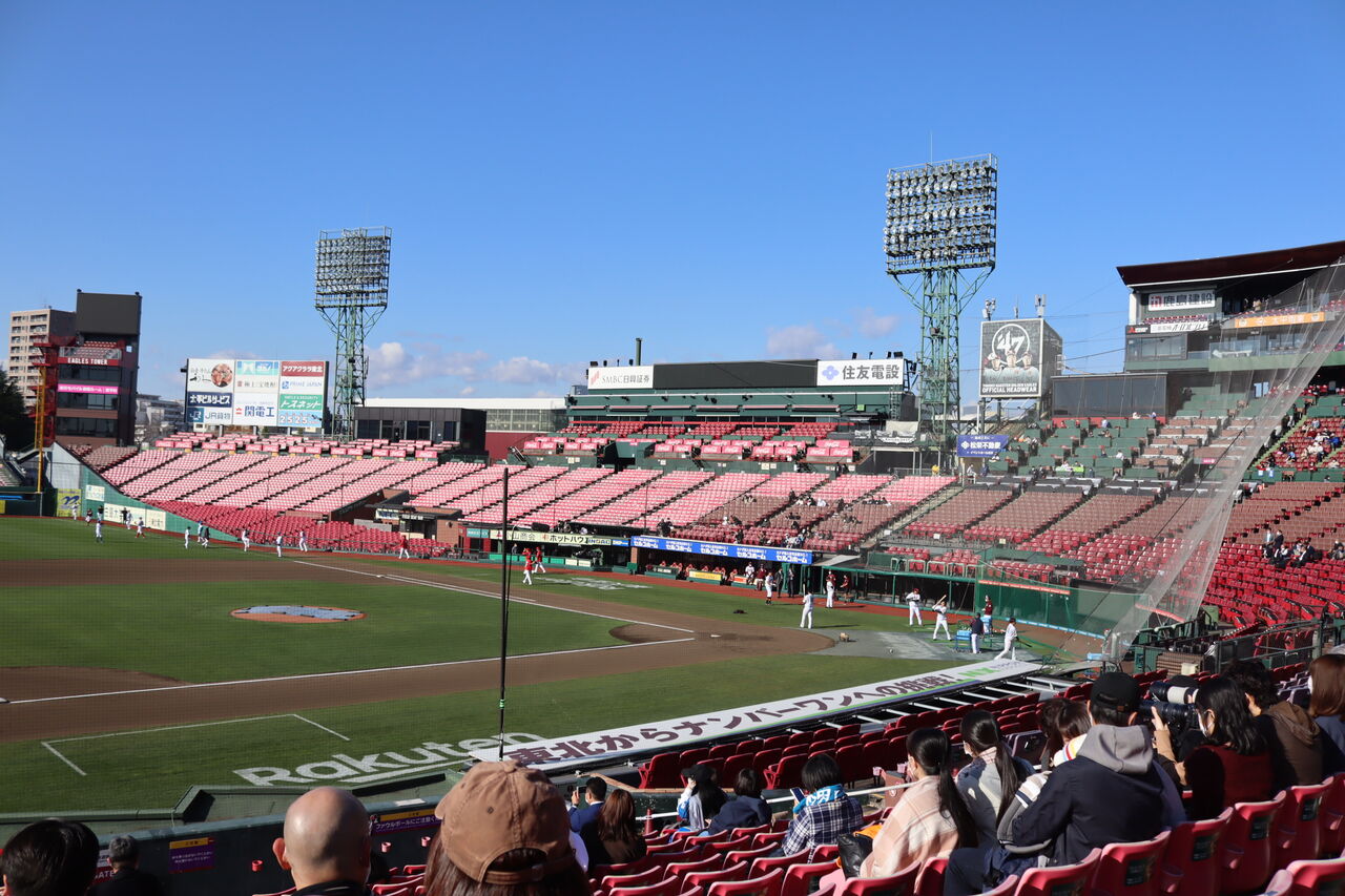 楽天モバイルパークは、クリムゾンレッドで統一されていて、見た目はクラシカルで割といいなと思うが、観客席は小さい上に、昔ながらのファウル除けのネットがあって、観戦する環境としては、最低クラスではないかと思う。ファウルグランドが狭いのは、MLBの球場っぽくっていいが、ホームランテラスが本当に必要かどうか。