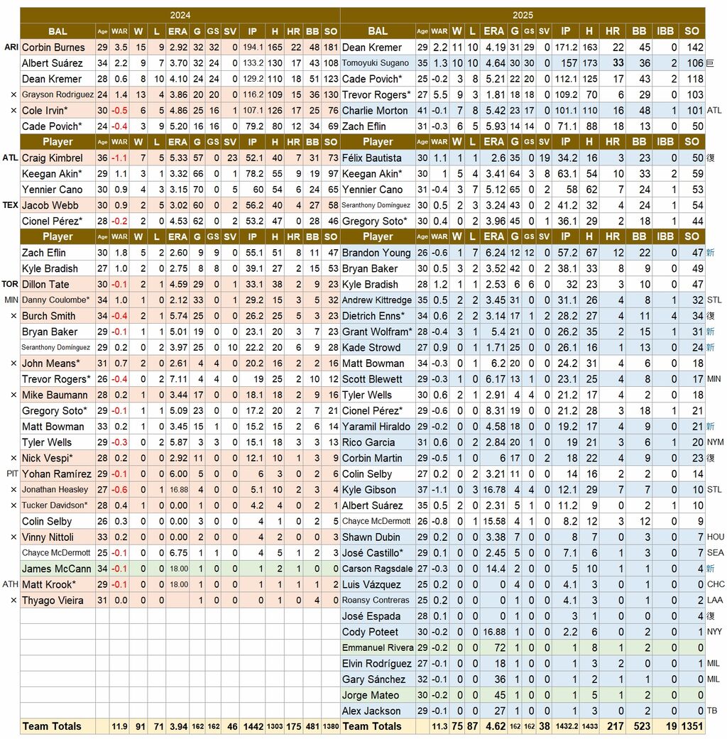 ブルワーズから来たエースのバーンズがダイヤモンドバックスへ移籍、2年目で二けた勝利を挙げたグレイソン・ロドリゲスはトミー・ジョン手術で全休。
