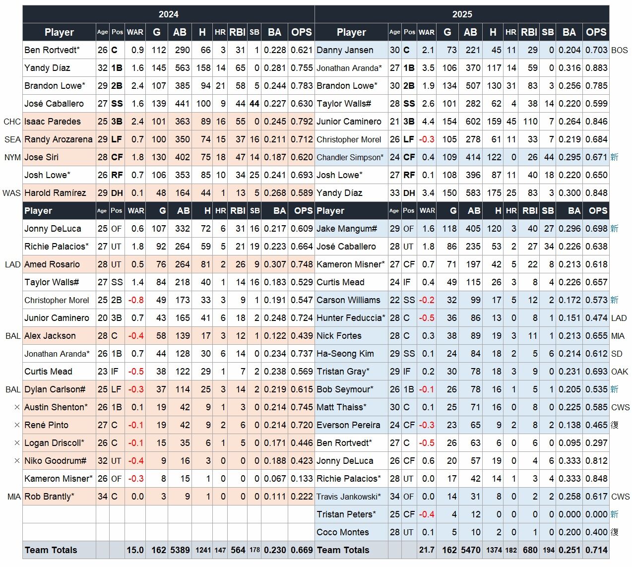 三塁、左翼、中堅のレギュラーが移籍するも、三塁手に抜擢した3年目21歳のジュニオール・カミネロが45本塁打110打点と大爆発。二塁のブランドン・ロウも31本塁打、一塁からDHに回ったディアズも25本、打線は明らかに底上げされた。