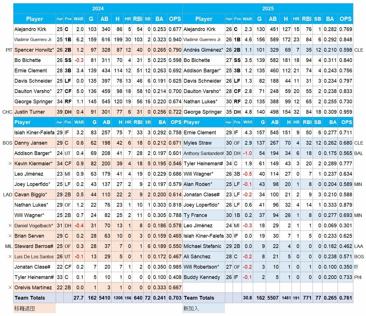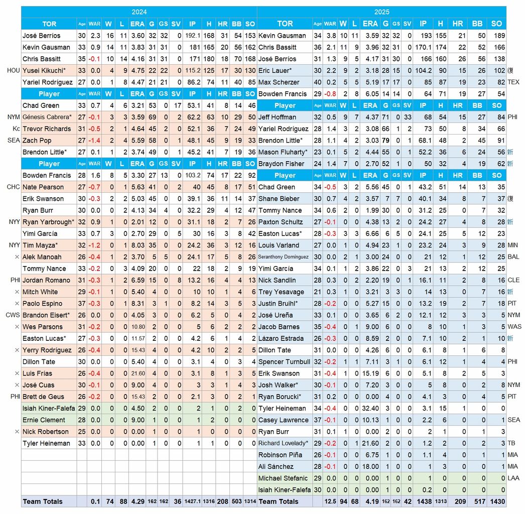 チームの柱、ゲレーロJr.はパワーダウンしたが、右翼からDHになったスプリンガー、三塁のバーガー、中堅のバーショウらが働き、全体としてはOPSは.703から.761にパワーアップした。