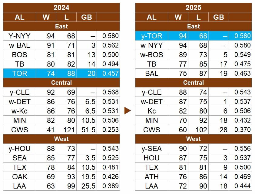 東地区はトータルで420勝390敗と勝ち越している。74勝は、他の地区なら最下位の数字ではないが、昨年は首位ヤンキースと20差の最下位だった。しかし今季は20勝積み上げ、ヤンキースと同率首位に。ヤンキースに8勝5敗と勝ち越してリーグ優勝した。