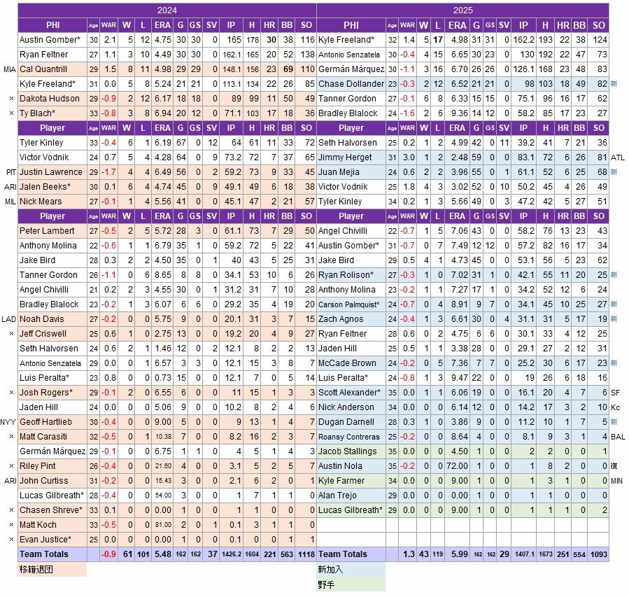 先発はクアントリルが移籍、他の二人はFA。このチームを経由したために成績が下落し、行き場を失う投手が散見される。