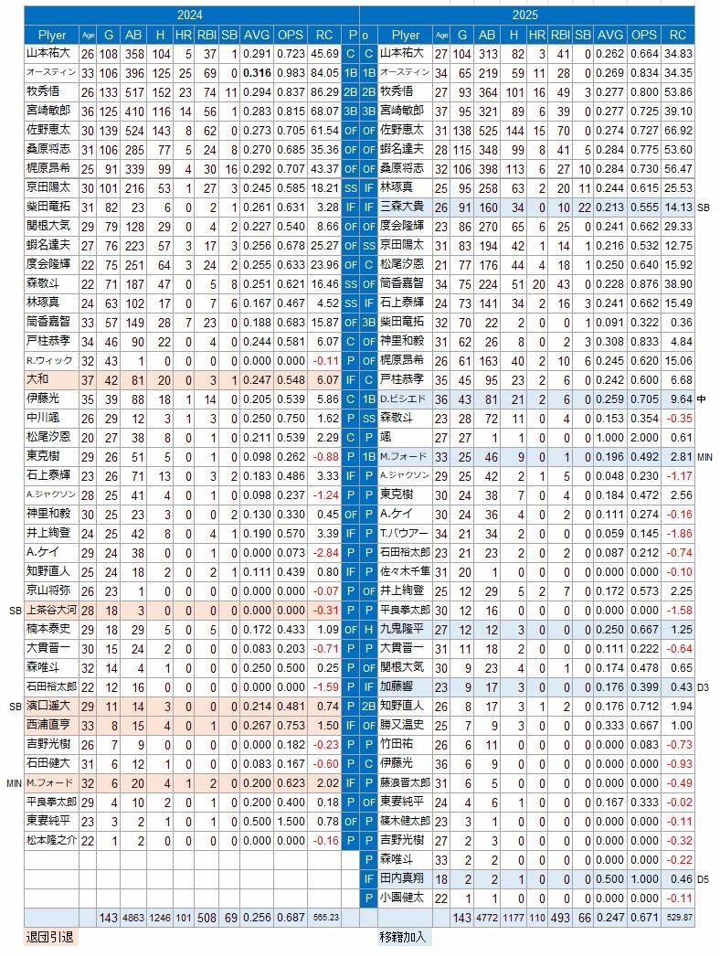 打線は大きな補強をしなかったが、オースティン、宮崎が戦線離脱、梶原昂希は不振、夏には牧まで負傷で出られなくなり、急遽、ビシエド、フォードを補強した。ソフトバンクから移籍した三森は足で貢献。筒香が後半から復活した。しかし打線はややパワーダウンした。
