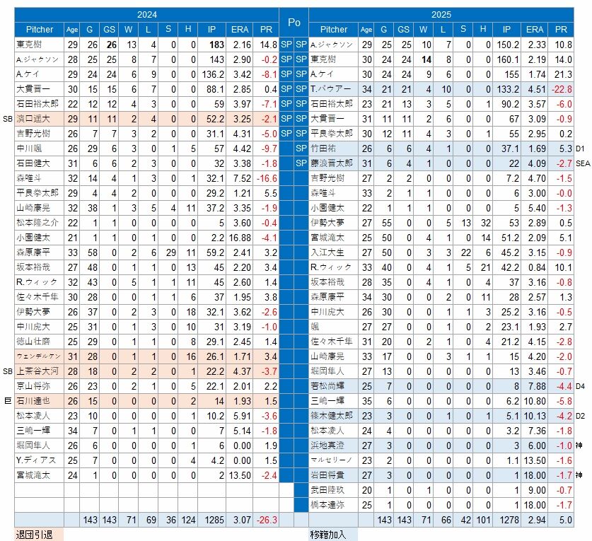 エースの東は安定感あるマウンドだった。ジャクソン、ケイの両外国人の成績が急上昇し、セ・リーグ屈指の3本柱となった。バウアーは出ると打たれる連続だったが、先発陣がチームを支えた。