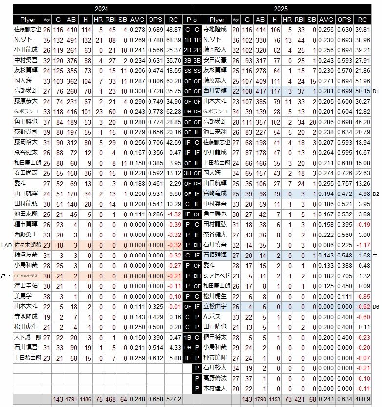 ソト、ポランコと2人の大砲で前年44本塁打だったのが、25年は18本に減った。二けた本塁打はソトと山本だけ。