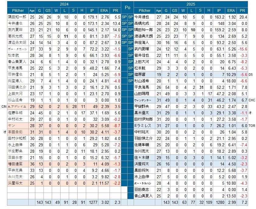 今井、髙橋、隅田が規定投球回数の到達。ローテは24年もしっかりしていたが、25年は今井がエースの働きだった。