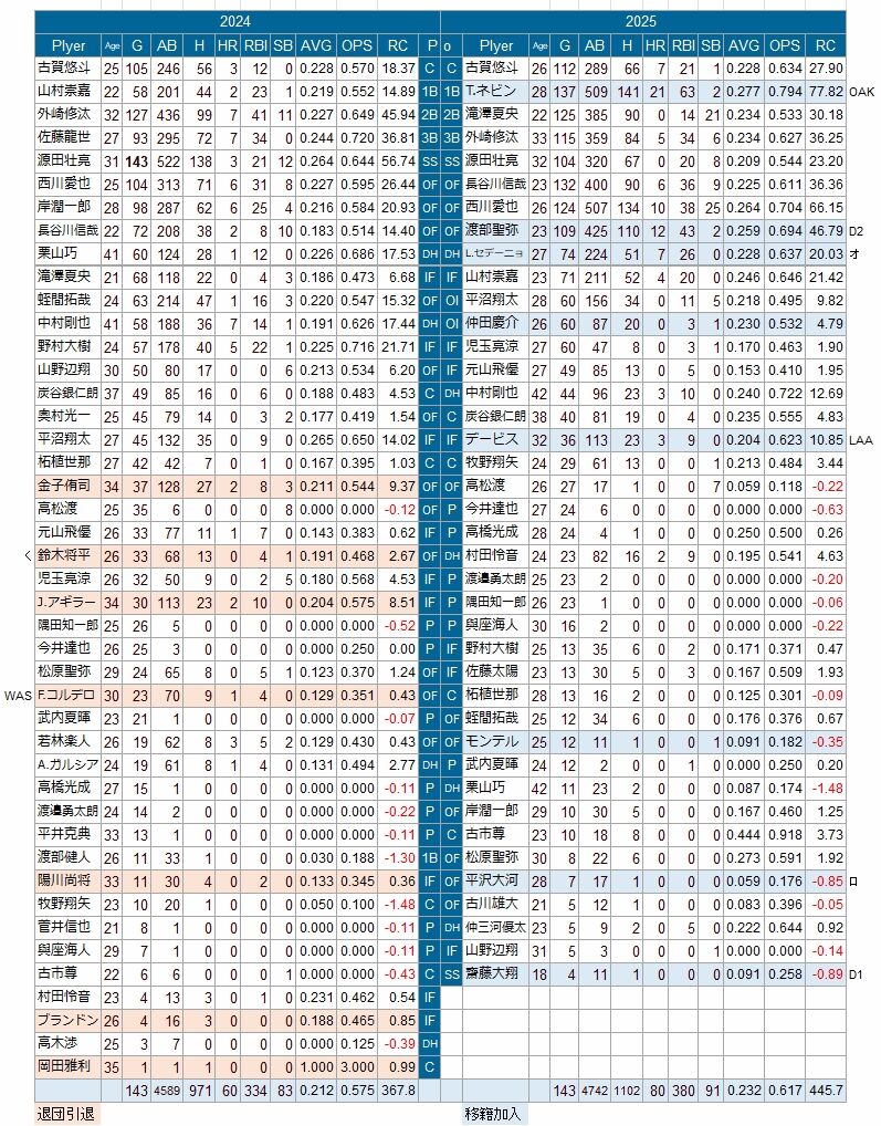 スキャンダルもあってチームリーダーの源田が試合数を大きく減らす。二塁にコンバートされた外崎も成績不振。三塁の佐藤は寝坊など生活態度の問題で、25年シーズンに中日にトレードされた。