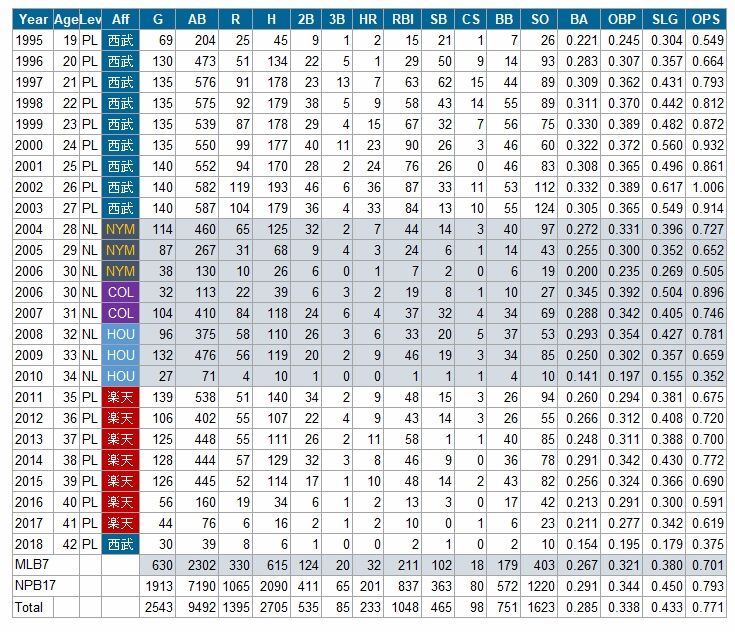 ほとんどの打者はMLBに行かない方が成績を残せたはずなのだが、とりわけ残念なのが松井稼頭央だ。