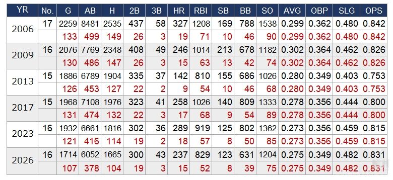2026年、平均の本塁打数が減少したのは、規定打席未達の村上、岡本、近藤健介、周東、吉田が参加したため。OPSは23年よりも上昇。選手が万全の体調なら今回は2006年に次ぐ強力打線だといえる。