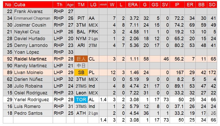 グレー地はマイナーリーグ、独立リーグなどだが、ほとんどがそういう投手で、中に二人、巨人のライデル・マルティネスとソフトバンクのリバン・モイネロ、NPBの先発、救援のトップ選手が屹立している。